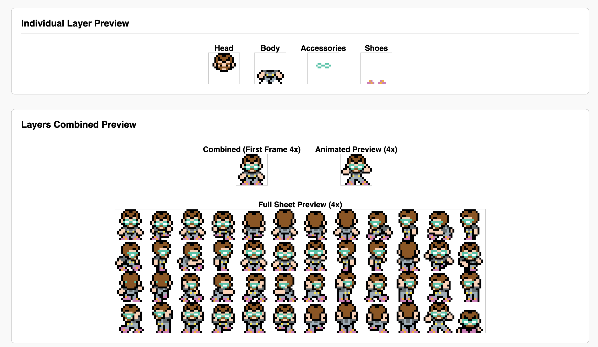 - A custom sprite builder so users can mix and match to build their own characters using accessories like hats, bandanas, and different colours/styles of glasses.