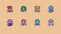 - February 08, 2024 by PixelFight2#retro, #2d, #top-down, #characters, #pixel-art, #sprites, #NES, #SNES, #Gameboy, #Zelda, #Final Fantasy, #RPG, #AdventureTwo new characters, Brown and Lavender added to this sprite pack with unique projectiles! All characters now also have the following new animation frames: Slide (4 Directions) Faint Underwater Movemen... Continue reading